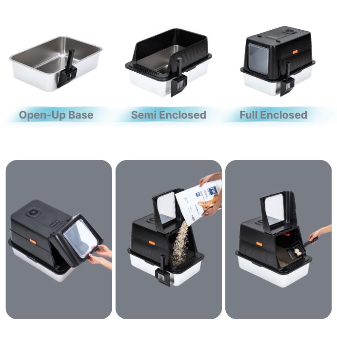 Use it your way — keep the top fully enclosed for maximum odor control and privacy, or easily remove it for open-top use. The 180° flip-front cover makes it simple to scoop or refill litter without bending or removing the entire top.