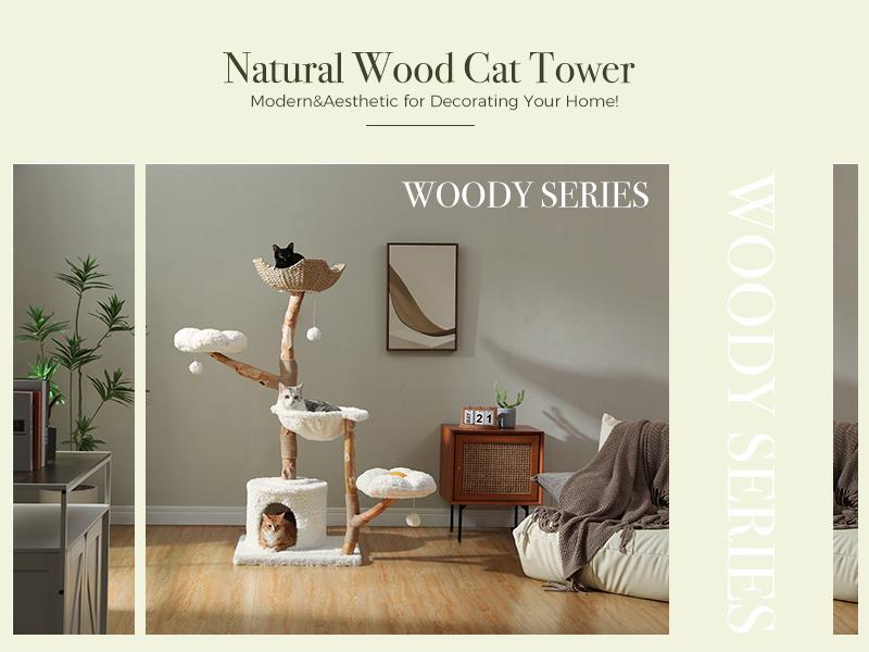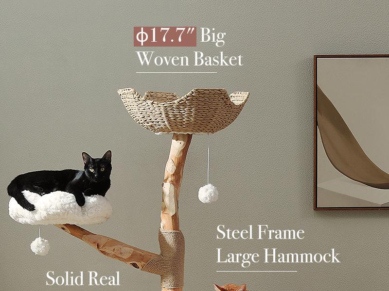 Features & Benefits Aesthetic and Natural Design: This 59-inch tall cat tree is artfully crafted from natural wood and woven... Read more