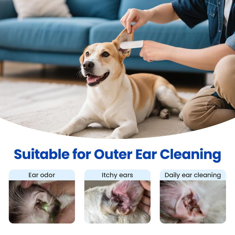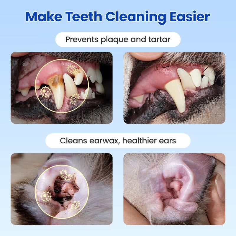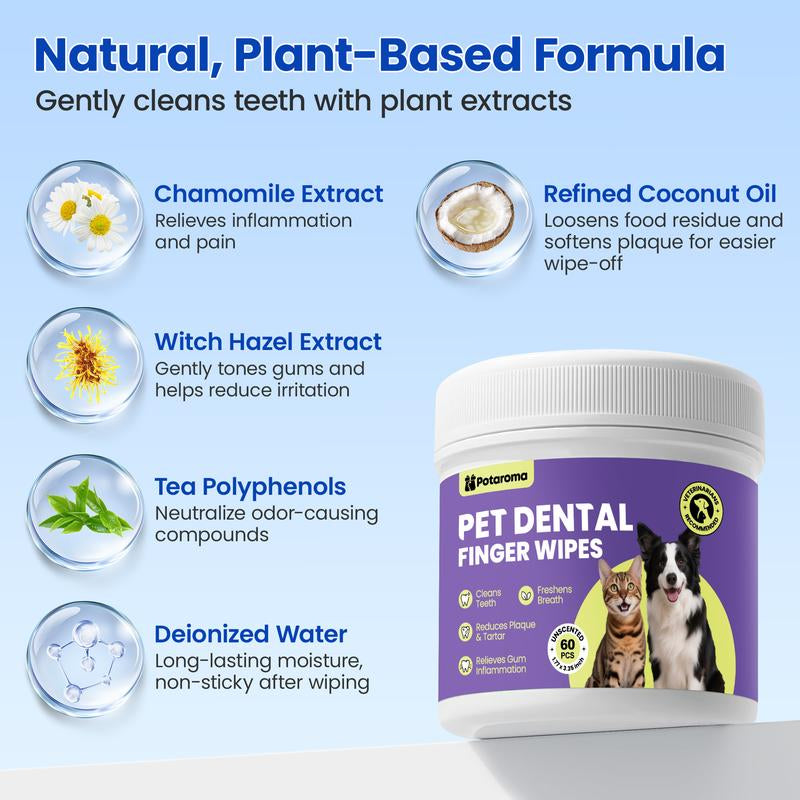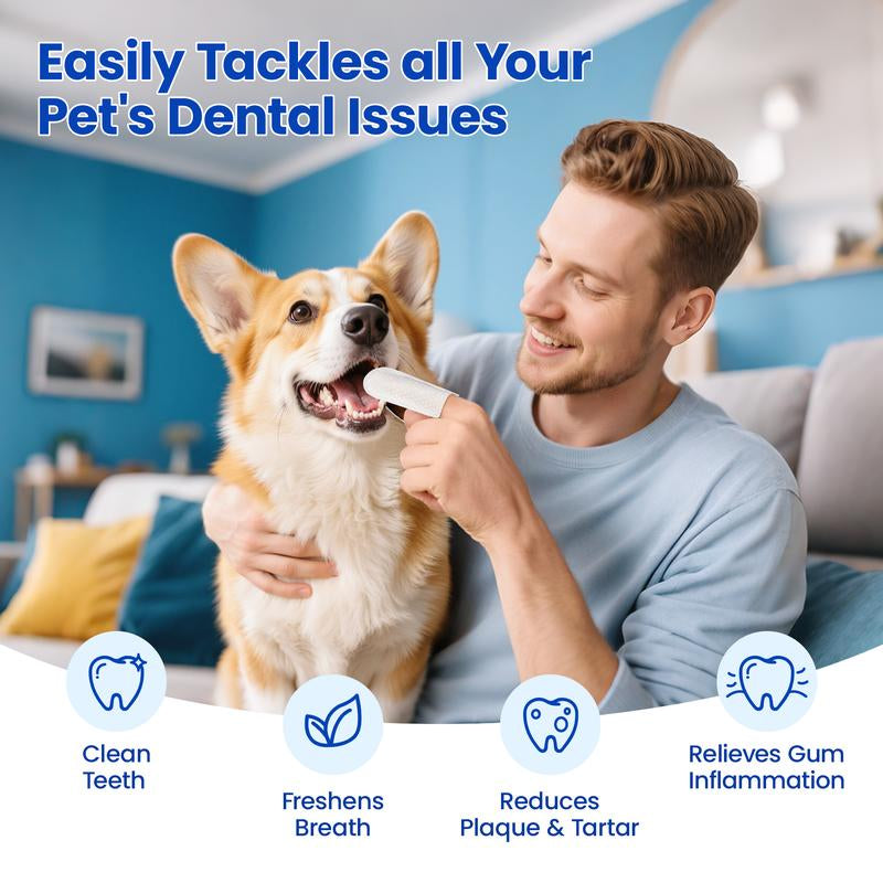Professional-Grade Care for Common Pet Oral Issues Designed for dogs and cats prone to bad breath, gum issues, or plaque buildup. The dual system (cetylpyridinium chloride + tea polyphenols) helps reduce recurring plaque, while witch hazel + chamomile are formulated to help soothe gums. Most Pets Accept Cleaning – Thanks to Our Honey-Infused Formula. A smart dental care kit for sensitive pets. Effectively Cleans Teeth & Wipes Away Tartar Our finger toothbrush wipes flexibly fit your finger to reach small pet's mouths and deep tooth gaps. They help cleaning tartar, food debris, and plaque buildup—an easy, brush-free oral care solution for your puppy, kitten, or senior pet. Gentle & Safe – No Harsh Ingredients Free of alcohol, parabens, mouthwash, and artificial fragrances. These pet dental wipes are safe even if licked. Unlike traditional hard toothbrushes, the soft finger brush design ensures a gentle, stress-free brushing experience. Made with durable non-woven fabric that won't shed or irritate your pet's mouth, perfect for pets with sensitive gums or fragile teeth. Say Goodbye to Pet Bad Breath – Long-Lasting Freshness These oral cleaning wipes are designed to help neutralize odor, and improve overall mouth hygiene. The finger design allows for deep cleaning, helping keep your dog or cat's breath fresh longer and cuddle-friendly. Portable Pack for Daily & Travel Use Comes with 60 pre-moistened wipes in a sealed lid container to prevent drying. Ideal for use after meals, while traveling, or as part of a daily tooth care routine for your pet. Use for teeth, gums, ears, and nose! Read more