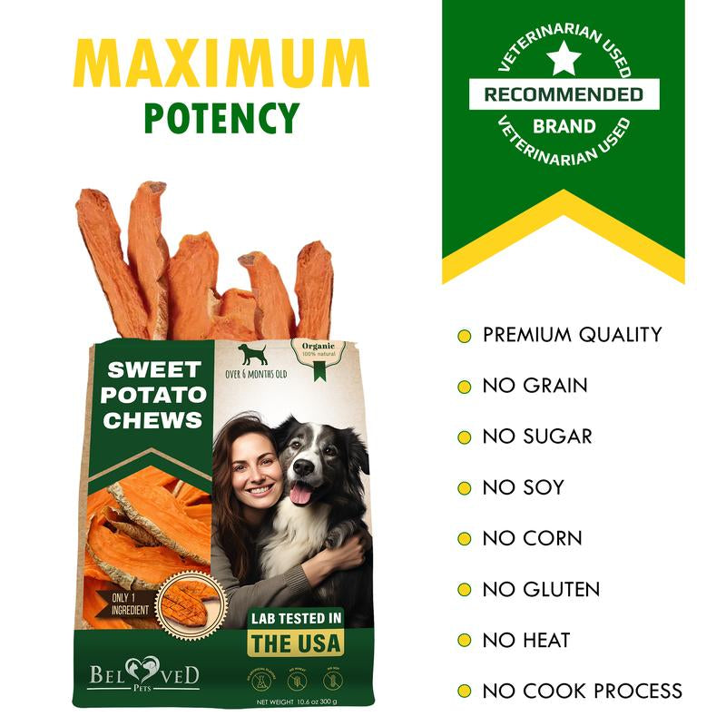 Single ingredient sweet potato dog treats: Made with 100% high-quality sweet potatoes, these chews offer a natural and healthy snack for your dog. They help reduce plaque and tartar, promote dental health, and keep jaws strong and breath fresh, making them perfect for training or rewarding your pet.
